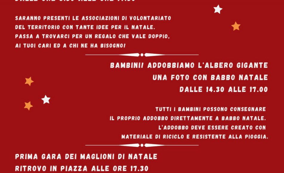 Giovedì 8 dicembre 2022 dalle 8:30 alle 13:00 in piazza San Giorgio a Chirignago. Sabato 10 dicembre 2022 dalle 14:30 alle 18:30 in piazza San Giorgio a Chirignago. ANNULLATO CAUSA MALTEMPO Domenica 11 dicembre 2022 dalle 8:30 alle 13:00 in...